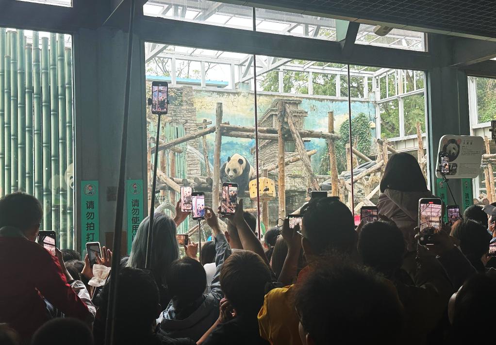 展厅玻璃前,里三层外三层围满了游客,大家高举手机、相机,不想错过大熊猫的每个精彩动作。只见活泼的“吉年”一会儿爬上木架,一会儿去玩水,一会儿又坐下来尽情啃着竹笋。“福将”则与写着“花好月圆”的丰容玩具打得火热,憨态可掬的模样惹人怜爱。