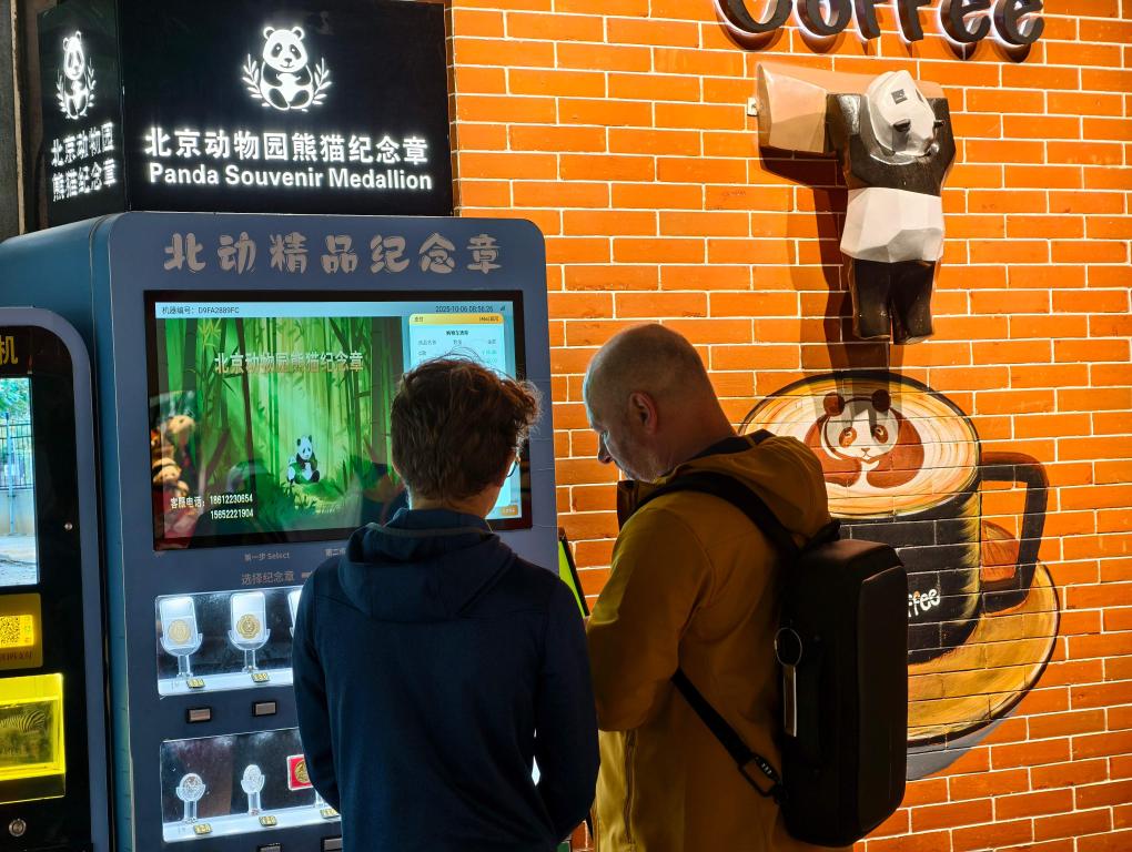 10月6日,外国游客购买北京动物园熊猫纪念章。新华社记者 王修楠 摄