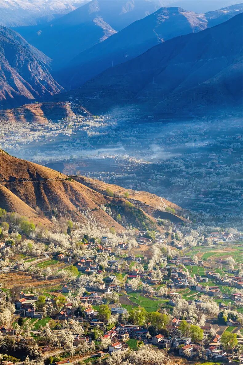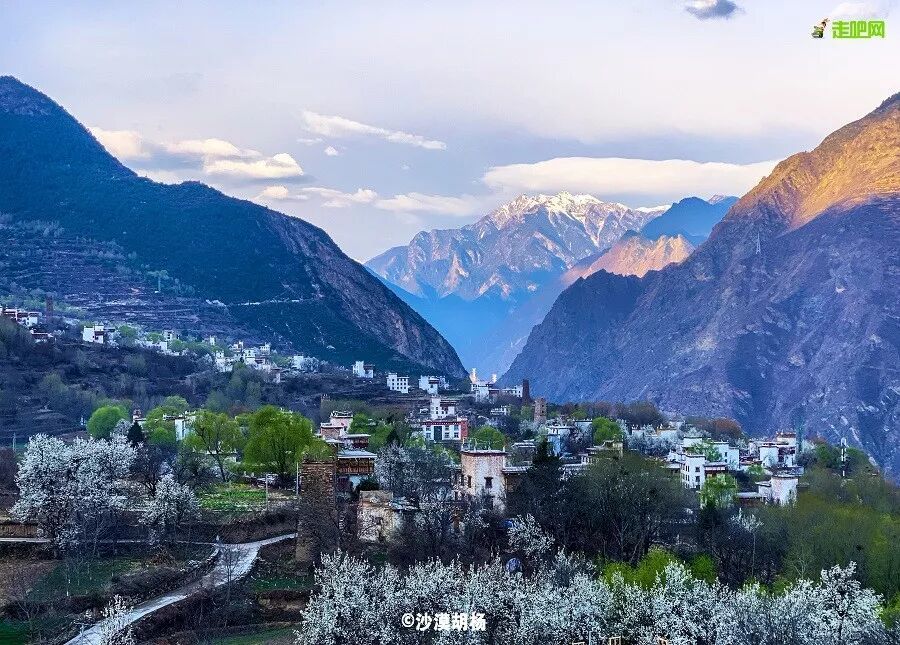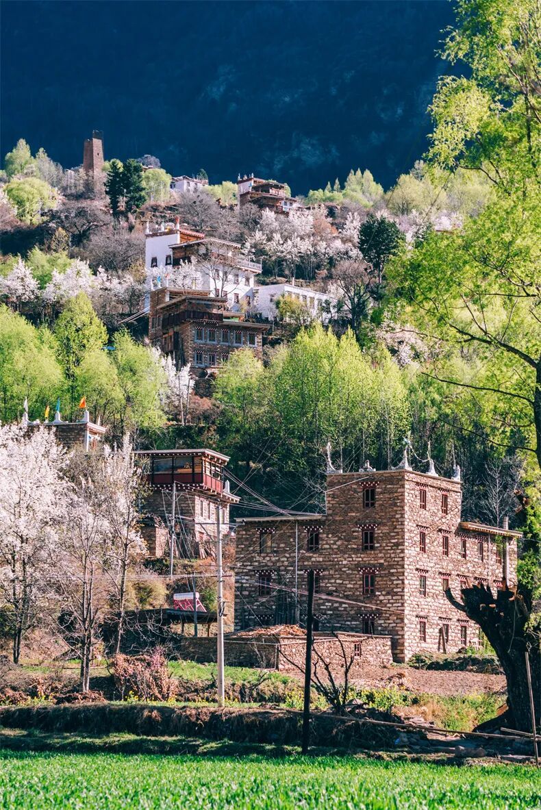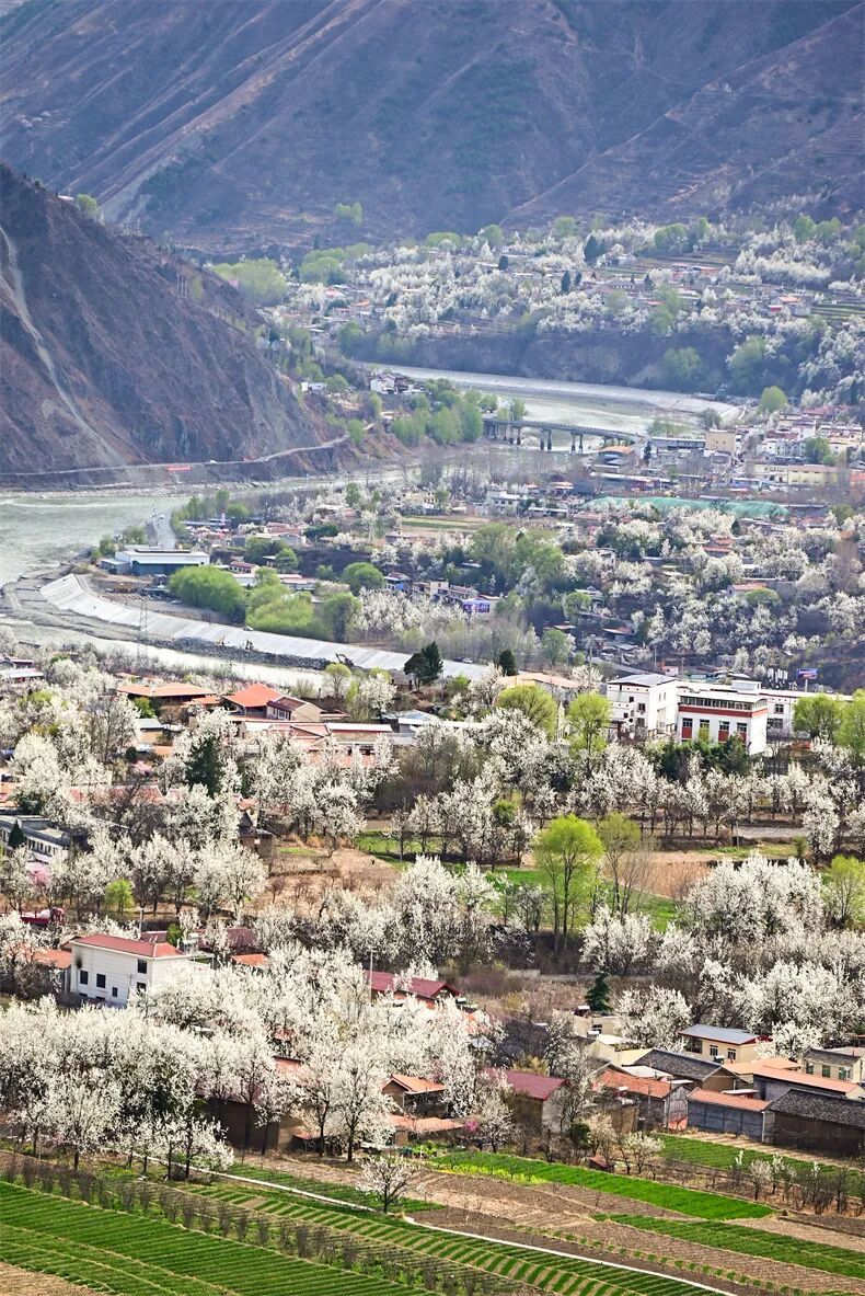 白的梨花、青的麦苗、红的藏寨,