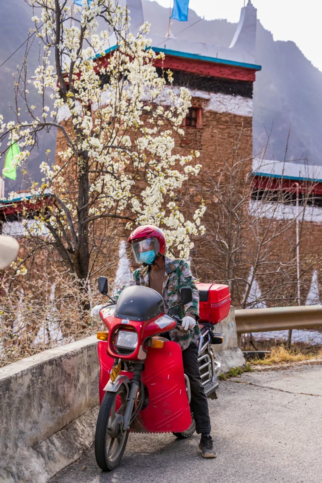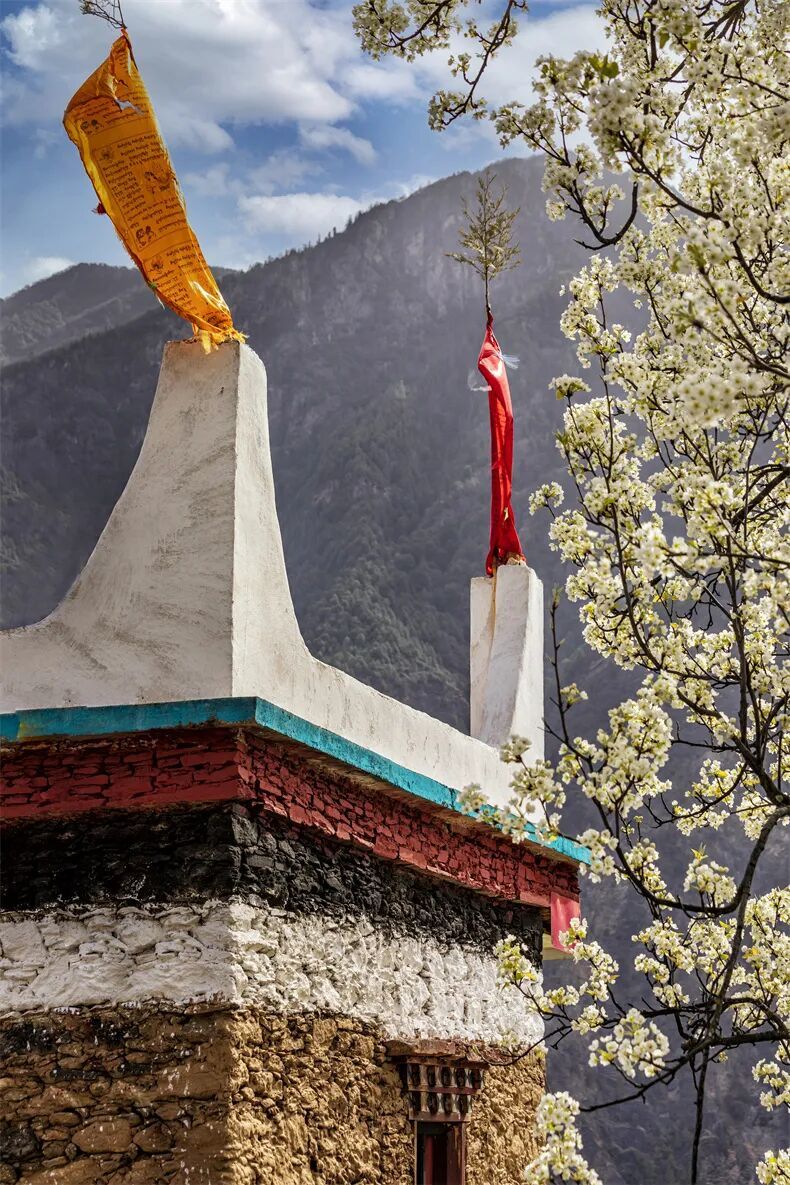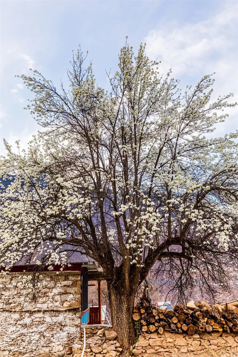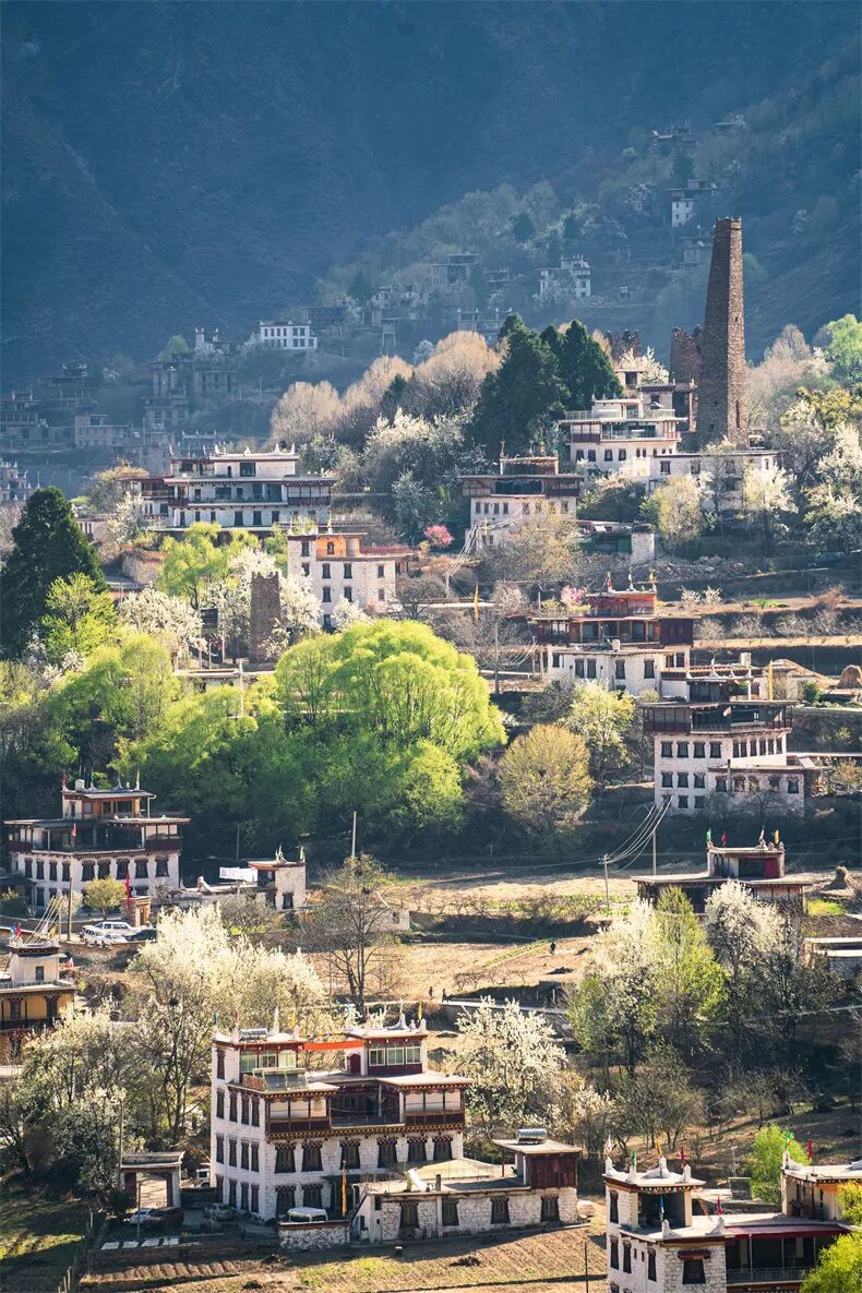 梨花盛开在碉楼旁、藏寨间;