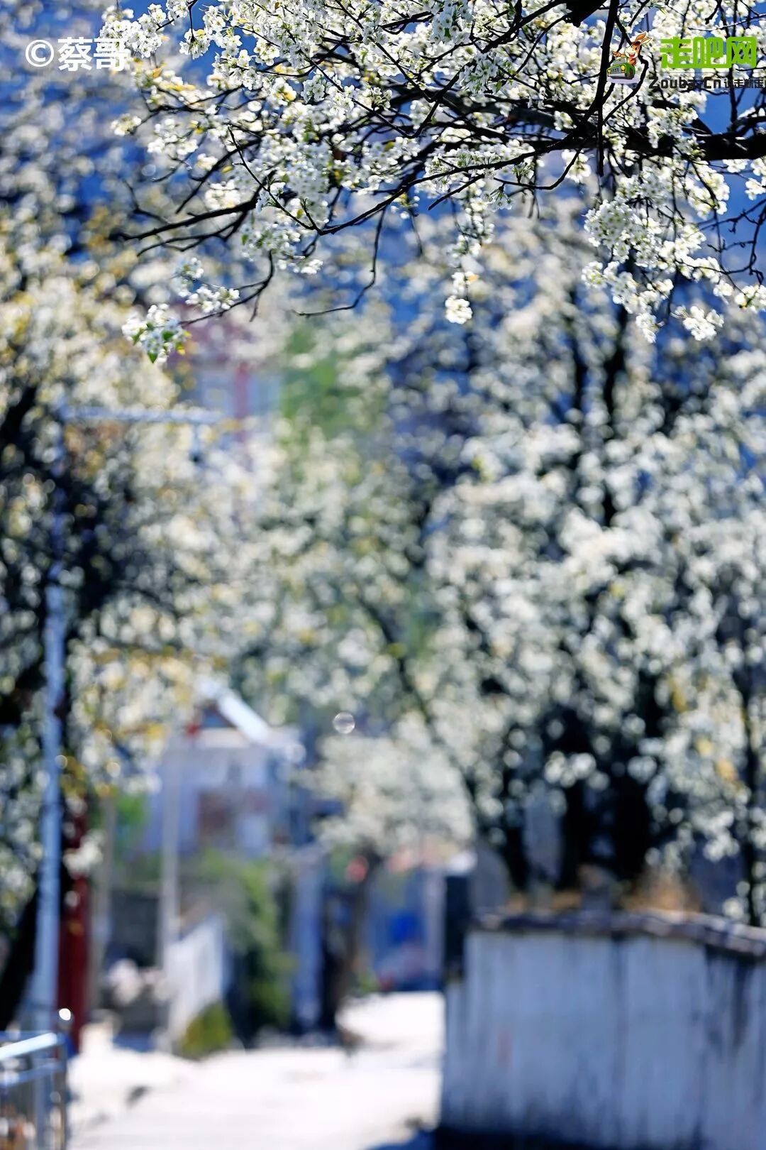 路两旁满是盛开的梨花树,