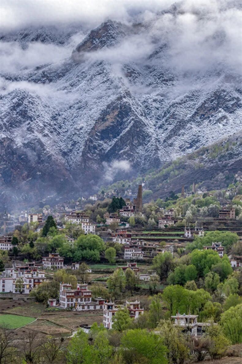 甲居藏寨坐落在卡帕玛群峰脚下,