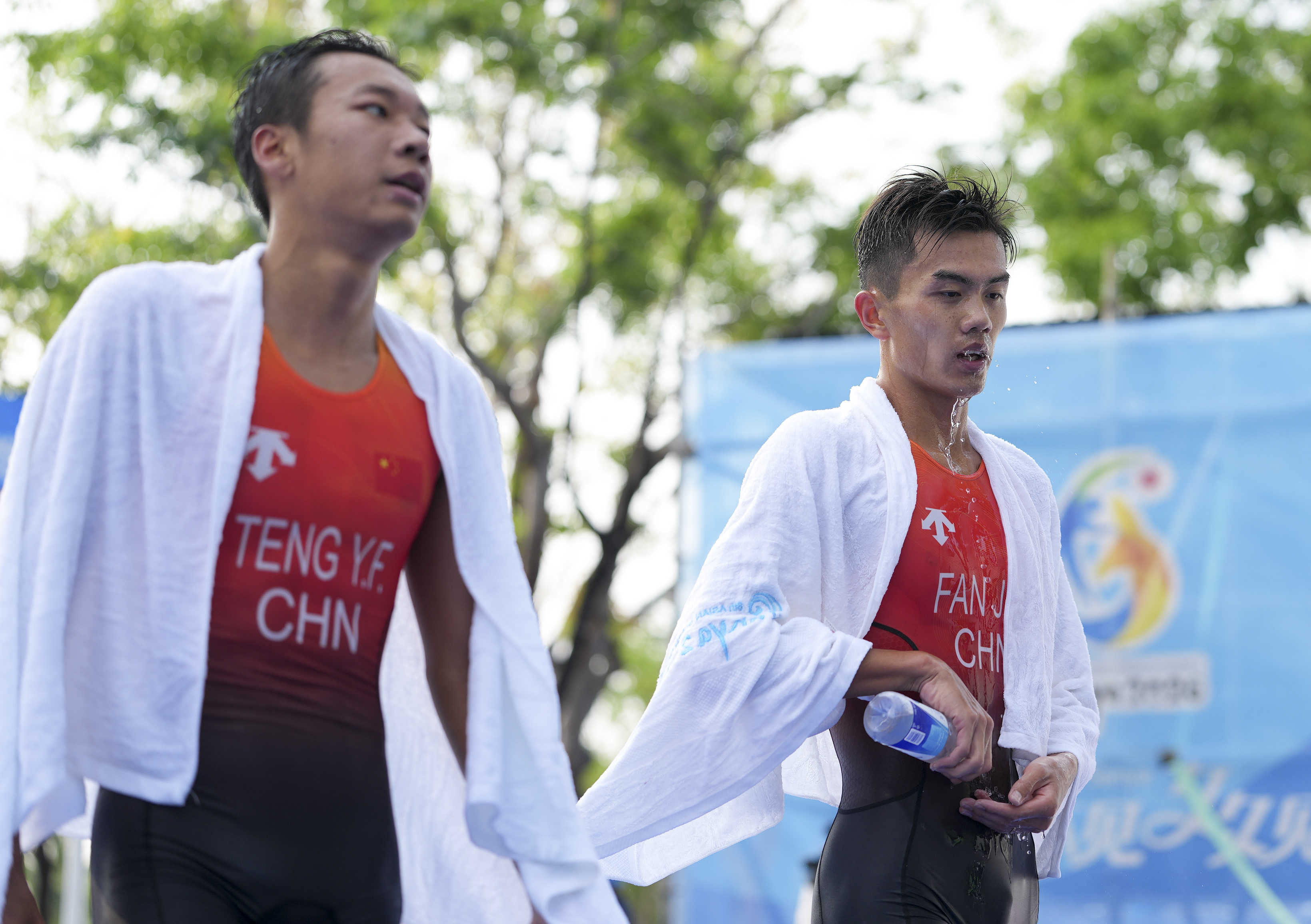 4月23日,冠军中国选手范俊杰(右)和亚军中国选手滕云峰在比赛后。新华社记者 潘昱龙 摄