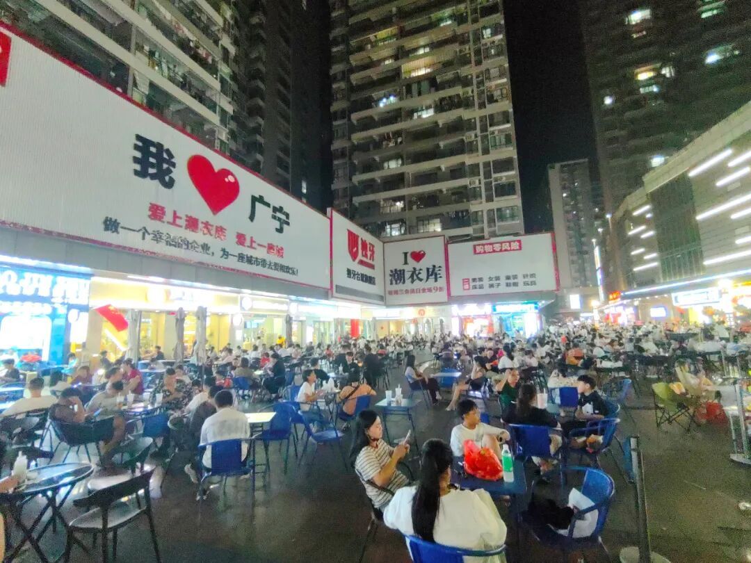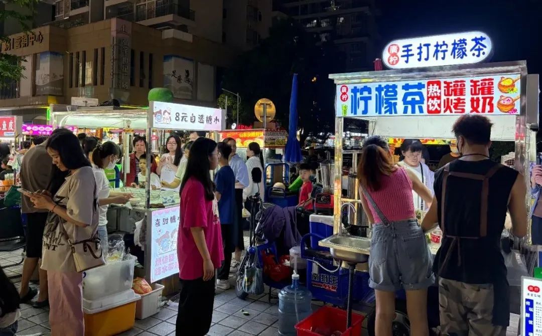 到了夜晚,消费热情丝毫不减。弘宇广场、城东广场等商圈成了 “不眠欢乐场”:喷泉旁的地摊市集上,玩具、饰品琳琅满目,露天区域的蹦蹦床、旋转木马前挤满家庭,孩子的笑声、家长的呼唤声、音乐声交织成最动听的夜曲。