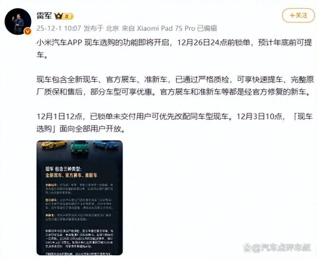 小米汽车这次推出的现车选购服务,可不是简单地清理库存(当然估计小米也没什么库存),而是通过精细化分类和流程设计,试图满足差异化的消费需求。根据官方信息,现车资源主要分为三类:全新现车、官方展车以及准新车。全新现车是指未经过任何使用、甚至部分还保留出厂保护膜的车辆,其来源主要是因配置选择错误、系统故障或用户个人原因取消的订单车辆,本质仍是新车。
