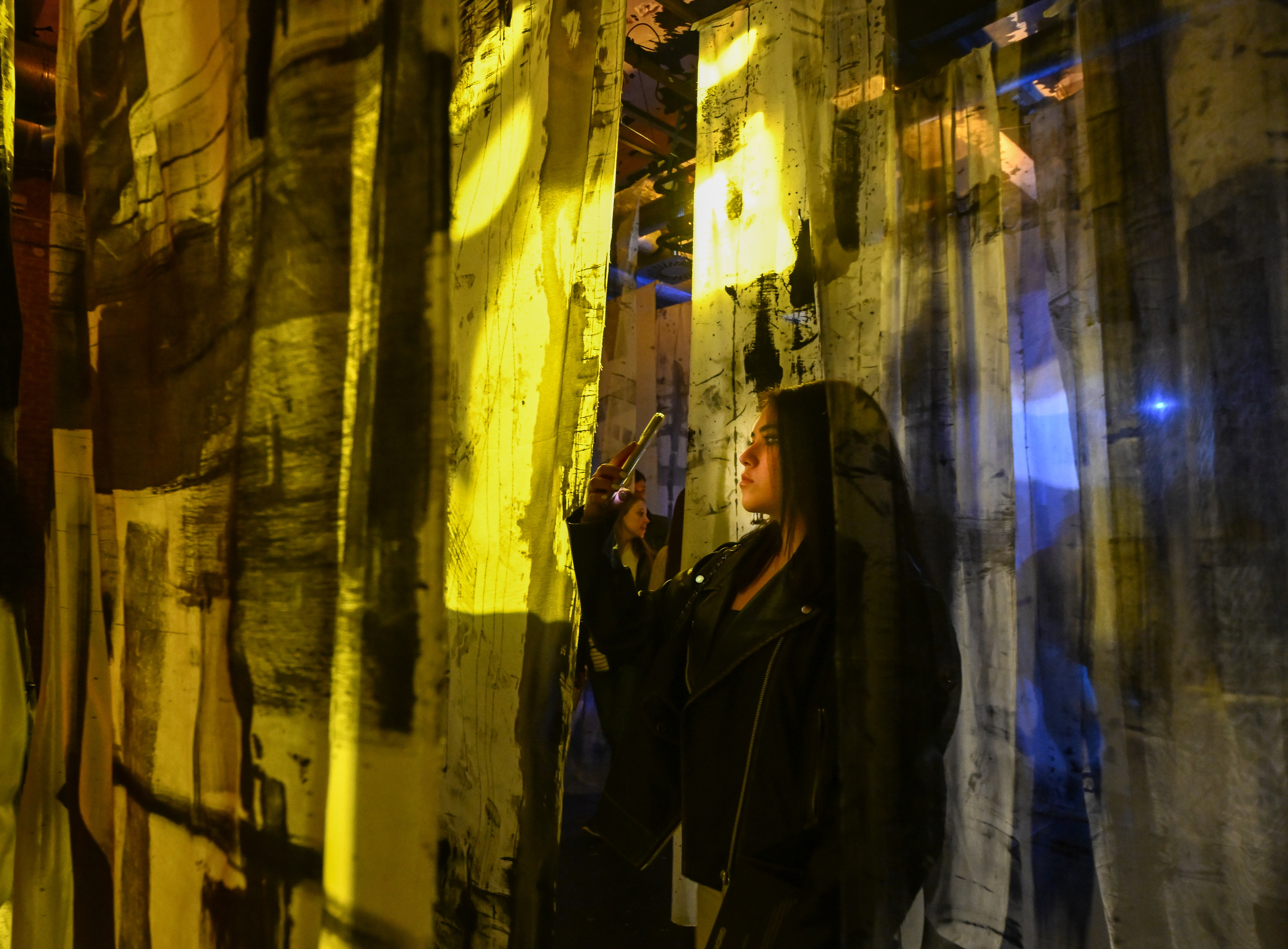 3月13日,一名女子在西班牙马德里灯光节上参观灯光装置作品。新华社记者 程敏 摄