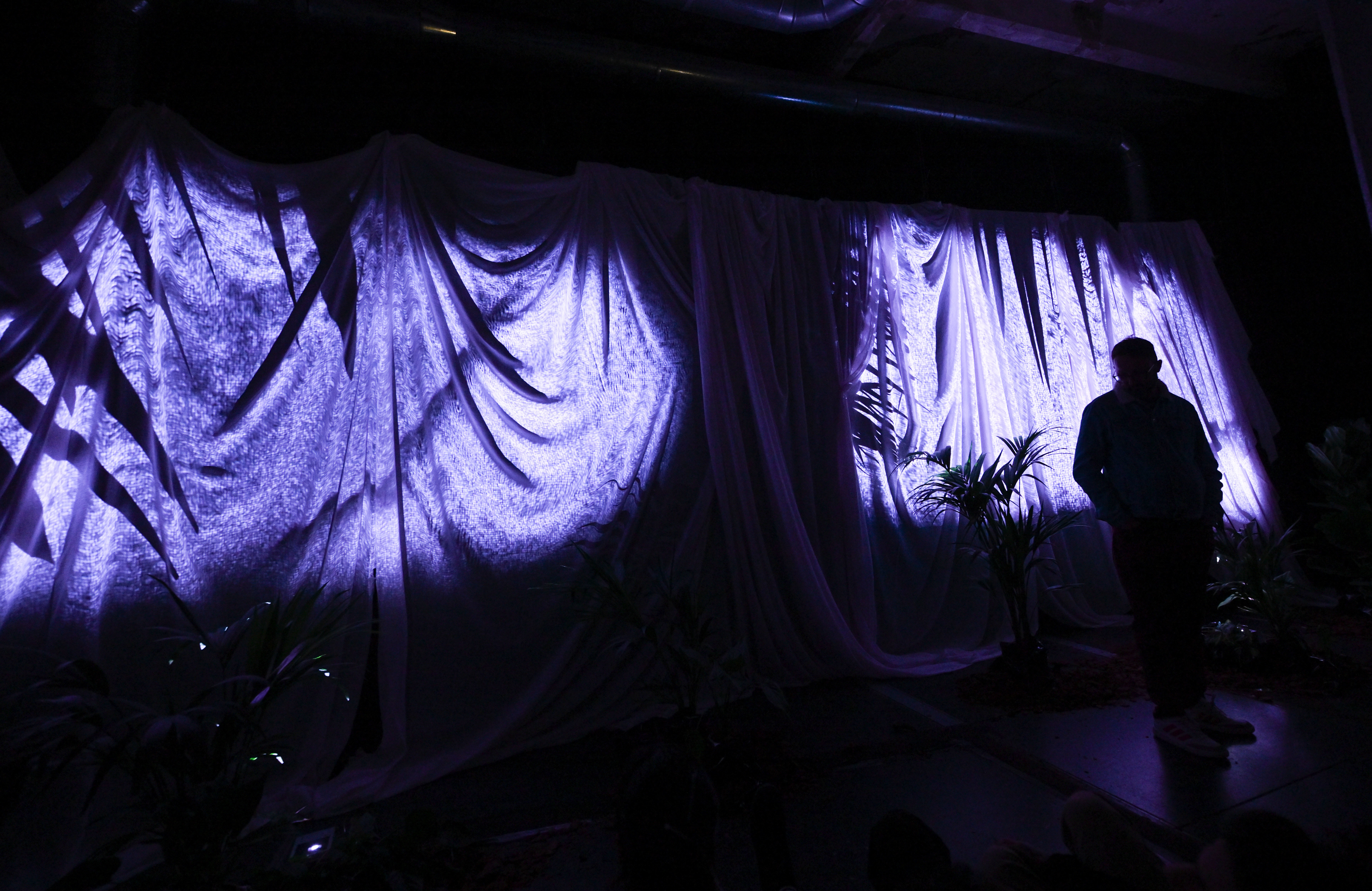 3月13日,一名男子在西班牙马德里灯光节上参观灯光装置作品。新华社记者 程敏 摄